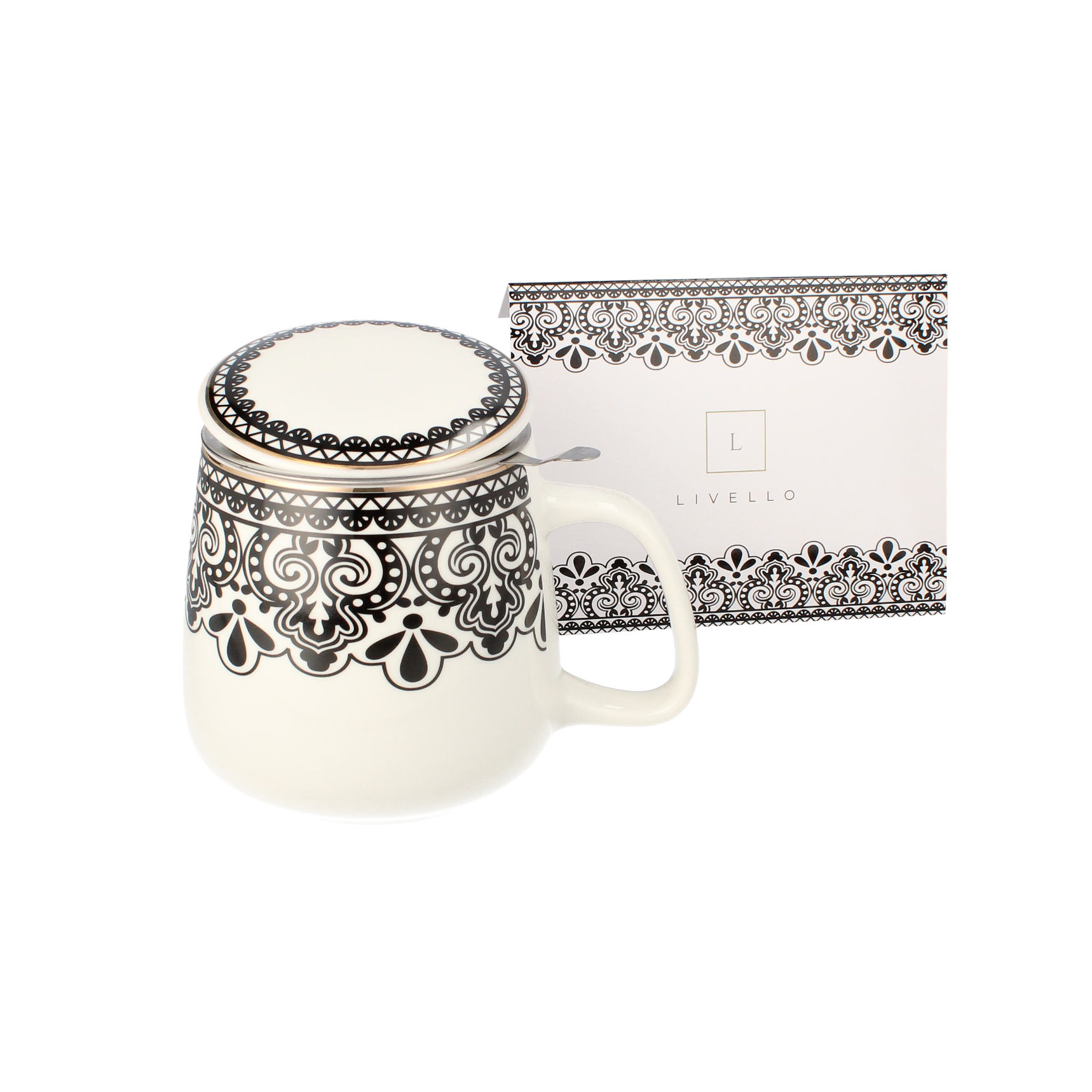 Zestaw porcelanowy Livello to połączenie elegancji i funkcjonalności w wyjątkowej formie. Składa się z kubka, sitka oraz przykrywki, a całość zdobi bogaty, ornamentowy wzór w odcieniach bieli i czerni z dodatkiem złotych elemantów, który nadaje mu luksusowy i ponadczasowy charakter. Doskonale sprawdzi się zarówno w domowym zaciszu, w biurze, jak i jako wysmakowany prezent dla miłośników stylowych dodatków.
