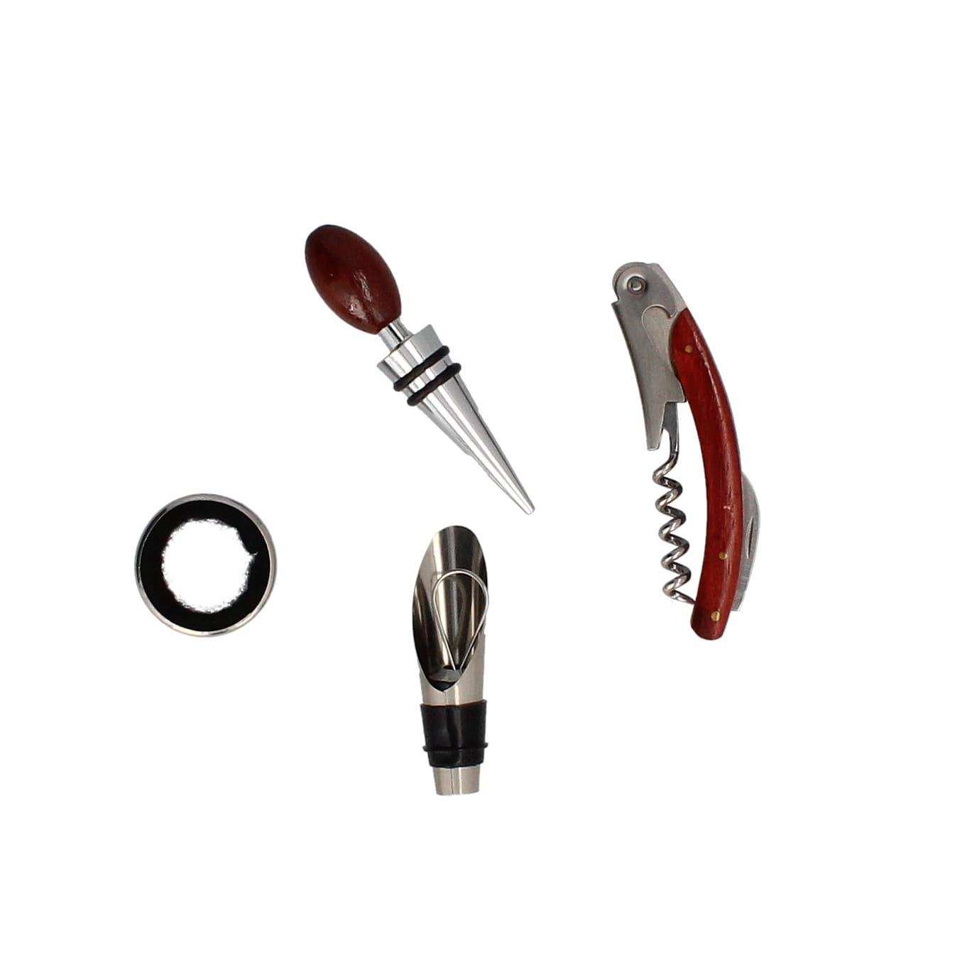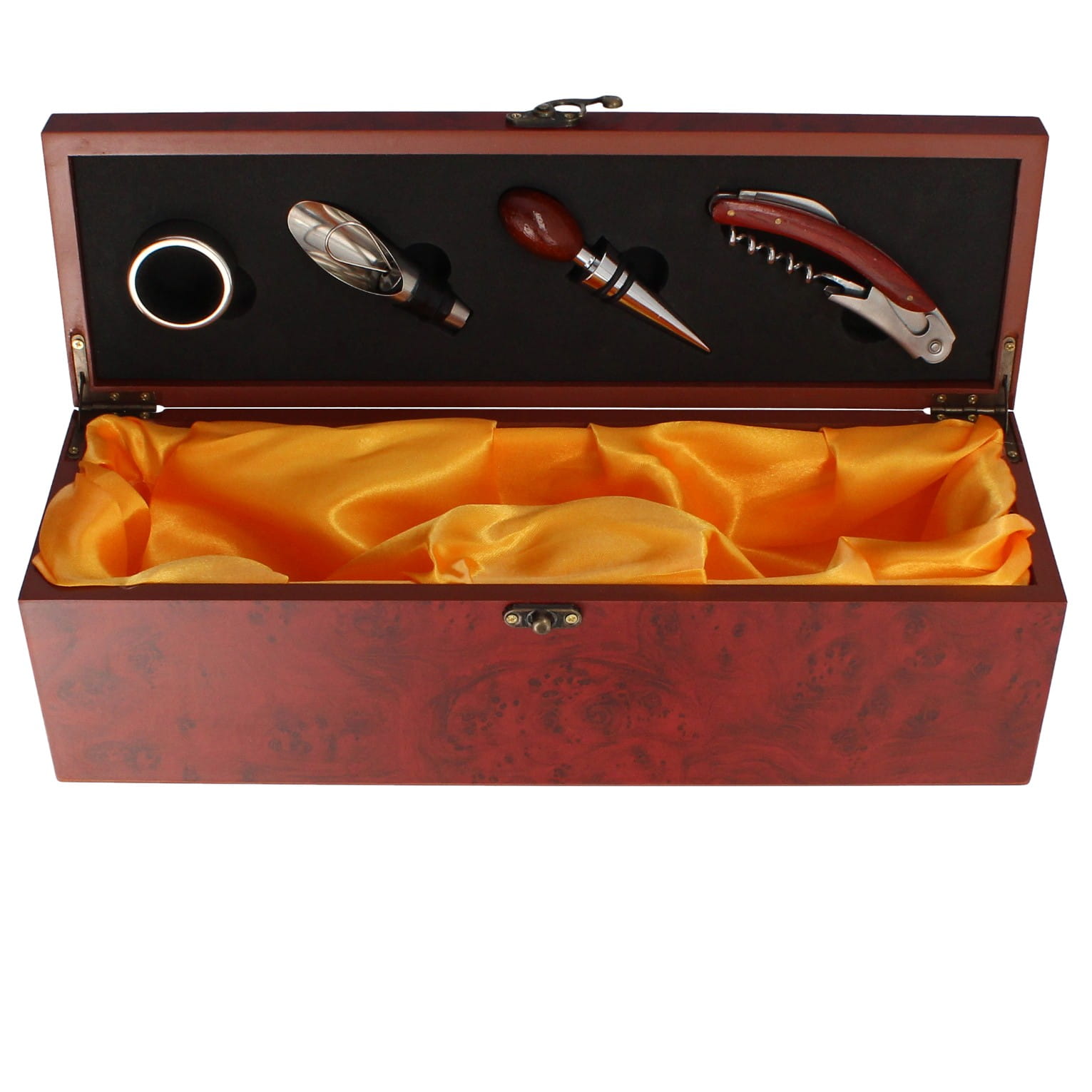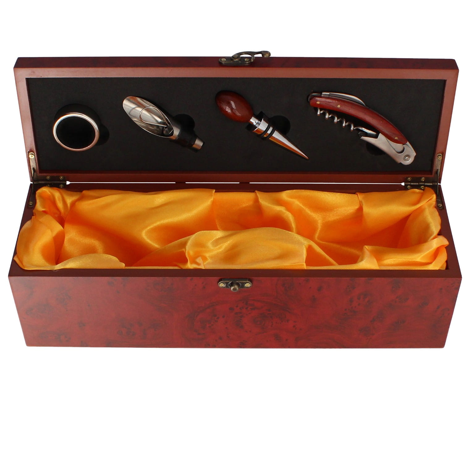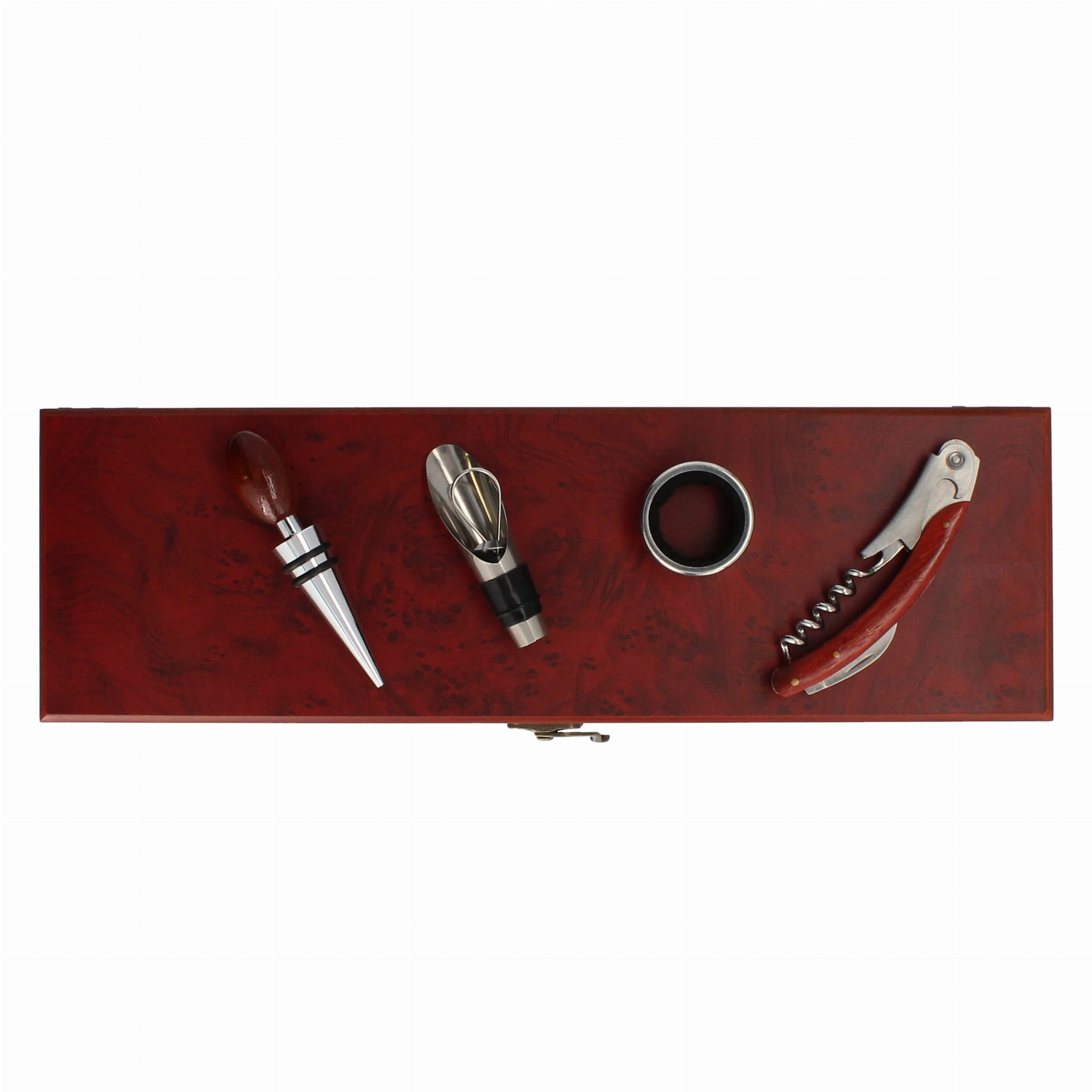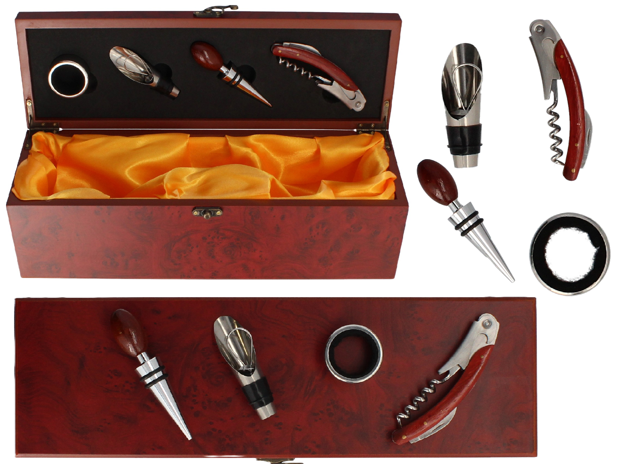 Ten produkt to elegancki zestaw akcesoriów do wina w drewnianym pudełku z wyściółką z satynowego materiału. W komplecie znajdują się cztery elementy, każdy o określonym zastosowaniu, umieszczone w górnej części pudełka. Całość prezentuje się stylowo i idealnie nadaje się na prezent dla miłośnika wina.
