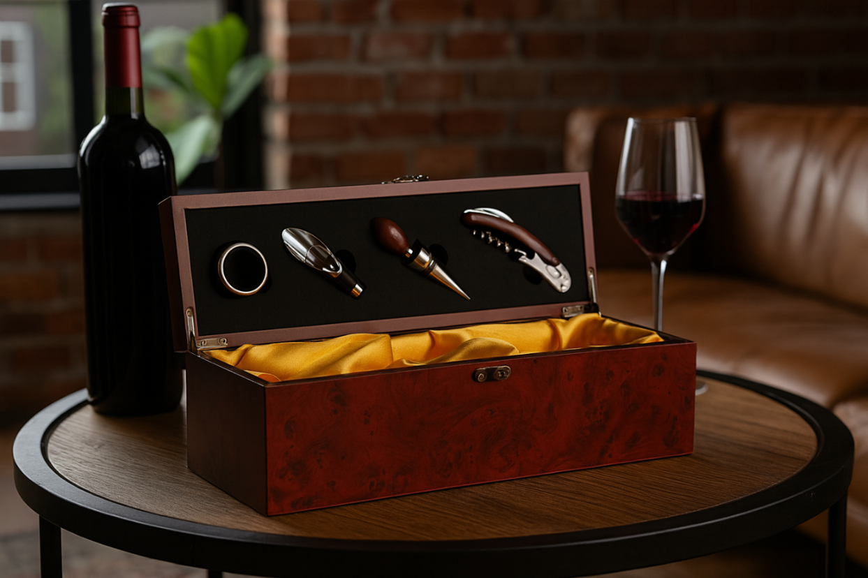 Skrzynka na wino zestaw Livello 4 el korkociąg nalewak korek pierścień